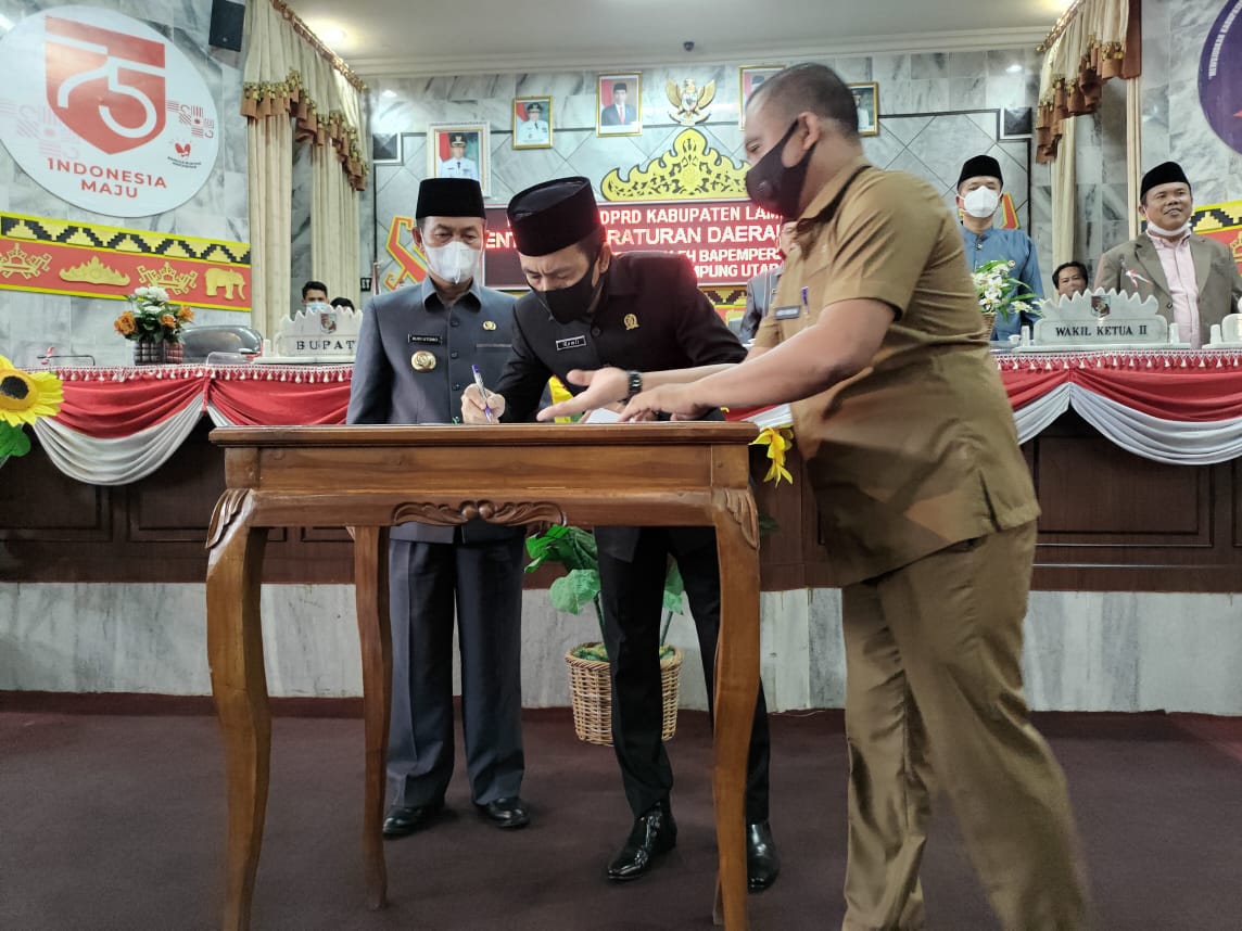 Paripurna dipimpin langsung oleh Ketua DPRD Kabupaten Lampung Utara, Romli, A.Md bersama Wakil Ketua 1 Madri Daud, SE.,MM, Wakil Ketua 2 H. Dedi Sumirat, dan Wakil Ketua 3 Joni Saputra, SE, berikut Anggota DPRD Kabupaten Lampung Utara, serta hadir Bupati Lampung Utara H. Budi Utomo, SE.,MM, Sekretaris Daerah Drs. Lekok, MM beserta Forkopimda Kabupaten Lampung Utara.