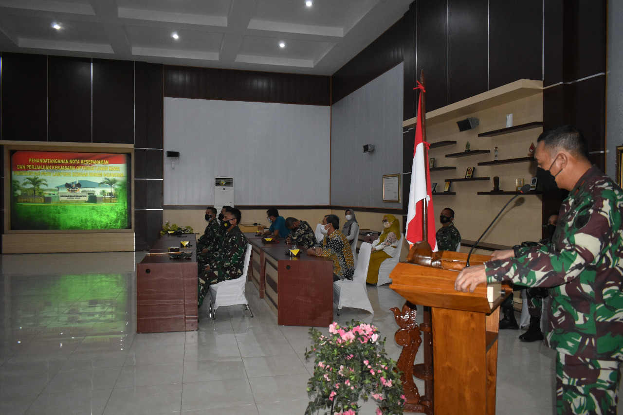 Bandar Lampung,- (BN.Net) Komandan Korem 043/Gatam Brigjen TNI Drajad Brima Yoga S.I.P., M.H menanda tangani Nota Kesepahaman dan Perjanjian Kerjasama Kegiatan Optimasi Lahan Rawa Provinsi Lampung Tahun Anggaran 2021, bertempat di Aula Ahmad Yani Makorem 043/ Gatam Jalan Tengku Umar No 85 Kelurahan Penengahan Kecamatan Kedaton Kota Bandar Lampung. Jum’at (09/07/2021)