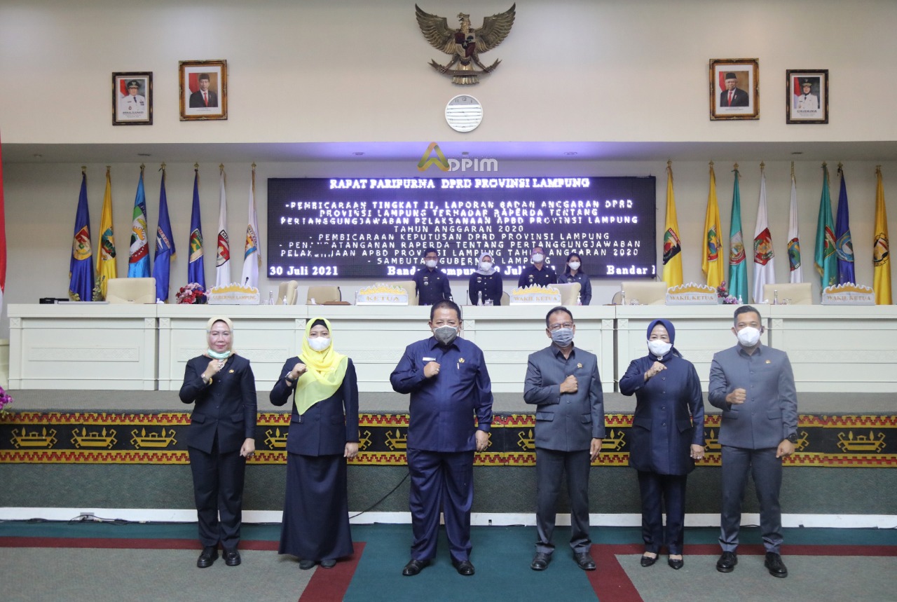 Bandar Lampung,- (BN.Net) Gubernur Lampung Arinal Djunaidi bersama Ketua DPRD Provinsi Lampung Mingrum Gumay dan 4 Wakil Ketua DPRD Lampung menandatangani persetujuan bersama Raperda Pertanggungjawaban Pelaksanaan APBD Provinsi Lampung Tahun 2020 di Ruang Sidang DPRD Provinsi Lampung, Jum’at (30/7/2021).
