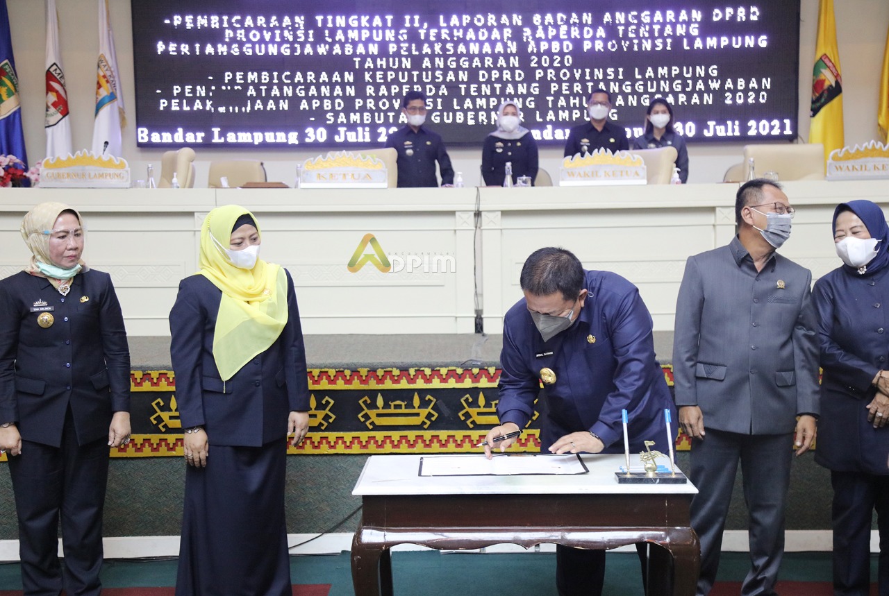 Gubernur Arinal dan DPRD Lampung Tandatangani Raperda Pertanggungjawaban APBD Tahun 2020.
