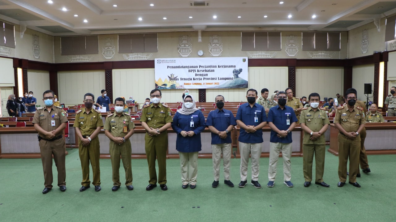 Bandar Lampung,- (BN.Net) Dalam rangka meningkatkan cakupan kepesertaan dan kepatuhan dalam pelaksanaan program Jaminan Kesehatan Nasional, BPJS Kesehatan Kedeputian Wilayah Banten Kalimantan Barat dan Lampung menggelar kegiatan penandatanganan perjanjian kerjasama bersama Dinas Tenaga Kerja Provinsi Lampung dan Dinas Tenaga Kerja Kota Bandar Lampung, Kabupaten Lampung Selatan, Pesawaran, Prigsewu, Tanggamus, Lampung Utara, Way Kanan, Lampung Barat dan Pesisir Barat tentang sinergi perluasan kepesertaan dan peningkatan kepatuhan dalam penyelenggaraan Program JKN-KIS secara ofline dan online di Gedung Pusiban Kantor Pemerintah Provinsi Lampung (11/01/2022).