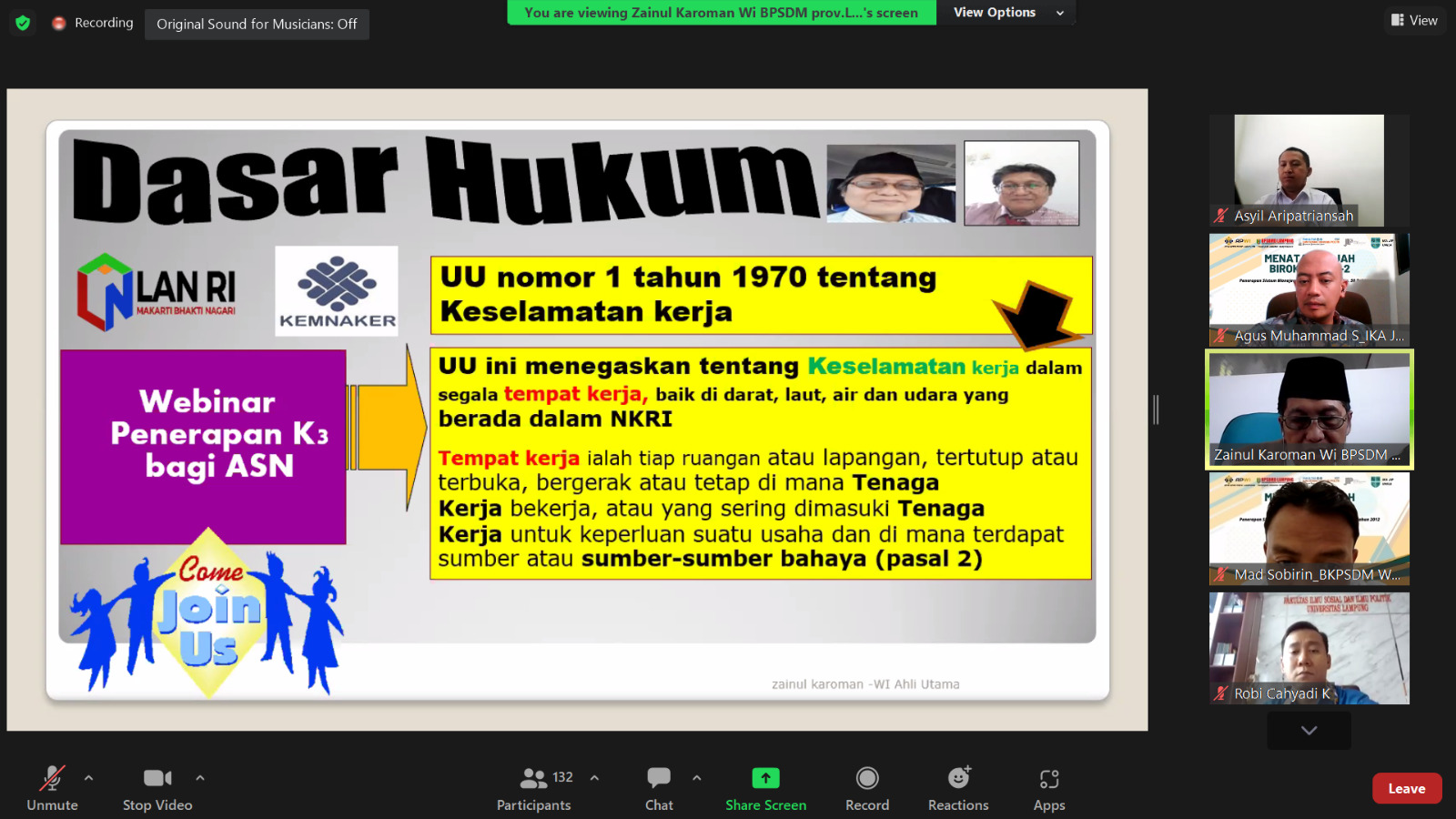 Zainul Karoman, S.I.P., M.M., M.A.P. sebagai Widyaiswara Ahli Utama BPSDMD Provinsi Lampung dalam pemaparannya membahas Penerapan K3 Bagi ASN Pada Organisasi Perangkat Daerah. Penerapan Sistem Manajemen berdasarkan PP No. 50 Tahun 2012 tentang Penerapan SMK3 pada Bab 1 Pasal 1 Ayat 2 menjelaskan bahwa K3 yaitu segala bentuk kegiatan untuk menjamin, melindungi Keselamatan, Kesehatan Tenaga Kerja, melalui upaya pencegahan Kecelakaan dan PAK.