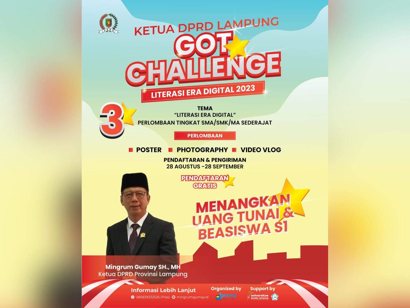 Salah satu aspek paling menarik dari GOT CHALLENGE adalah peluang untuk meraih beasiswa S1. Ketua DPRD Lampung, dalam semangat mendukung pendidikan dan perkembangan pemuda, telah menyediakan beasiswa bagi pemenang kompetisi. Ini adalah kesempatan langka untuk mewujudkan impian pendidikan tinggi tanpa beban finansial yang berlebihan.