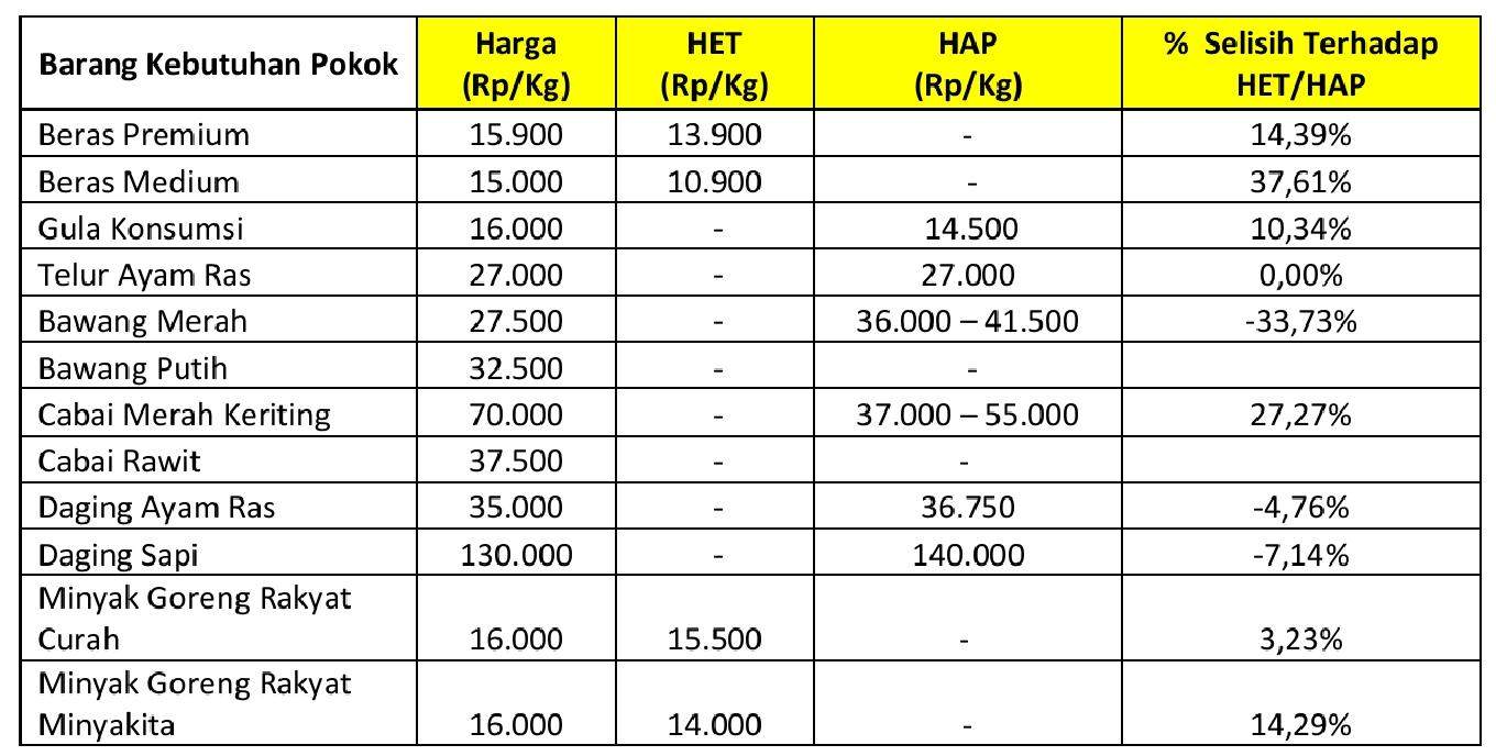 Selanjutnya, harga Daging Ayam Ras sebesar Rp 35.000,-/kg atau mengalami kenaikan 6 persen namun masih berada di bawah HAP (Perbadan No.5 Tahun 2022 HAP Daging Ayam Ras Rp 36.750,-/kg). Daging sapi terpantau stabil berada pada harga Rp 130.000,-/kg. Harga Minyak Goreng Rakyat Curah terpantau sebesar Rp 16.000,-/kg atau naik 2 persen dan berada 3 persen diatas HET sedangkan Minyak Goreng Rakyat kemasan Minyakita sebesar Rp16.000,- berada 14 persen diatas HET.