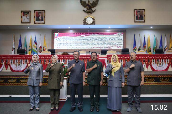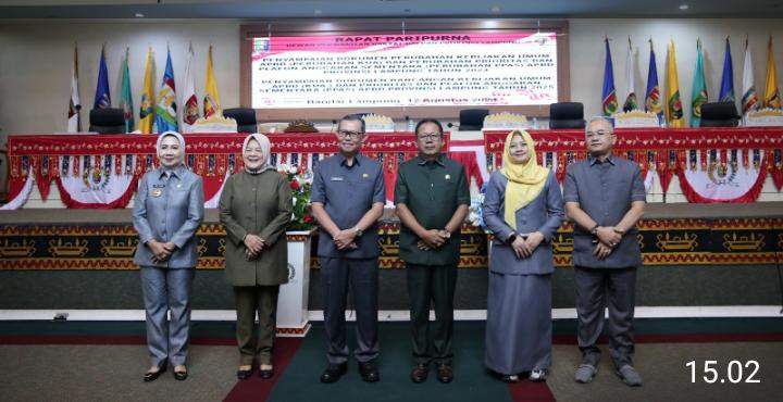 Bandarlampung,- (BN.Net) Sekretaris Daerah Provinsi Lampung Fahrizal Darminto, mewakili Pj. Gubernur Lampung Samsudin, menyerahkan dokumen Rancangan Perubahan Kebijakan Umum APBD (KUA) dan Prioritas Plafon Anggaran Sementara (PPAS) Tahun 2024 serta Rancangan KUA dan PPAS Tahun 2025 kepada Ketua DPRD Provinsi Lampung Mingrum Gumay dalam Rapat Paripurna DPRD Provinsi Lampung di Ruang Sidang DPRD Provinsi Lampung, Senin (12/8/2024).