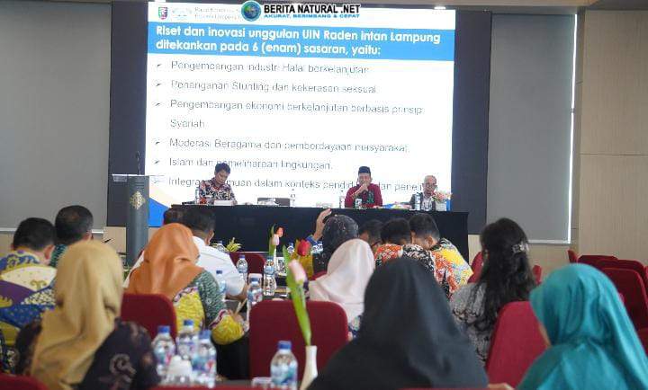 Prof. Kumedi memaparkan, riset unggulan UIN Raden Intan berfokus pada enam bidang utama, yaitu pengembangan industri halal berkelanjutan, penanganan stunting dan kekerasan seksual, ekonomi berkelanjutan berbasis syariah, moderasi beragama dan pemberdayaan masyarakat, Islam dan pemeliharaan lingkungan, serta integrasi keilmuan dalam pendidikan dan penelitian.