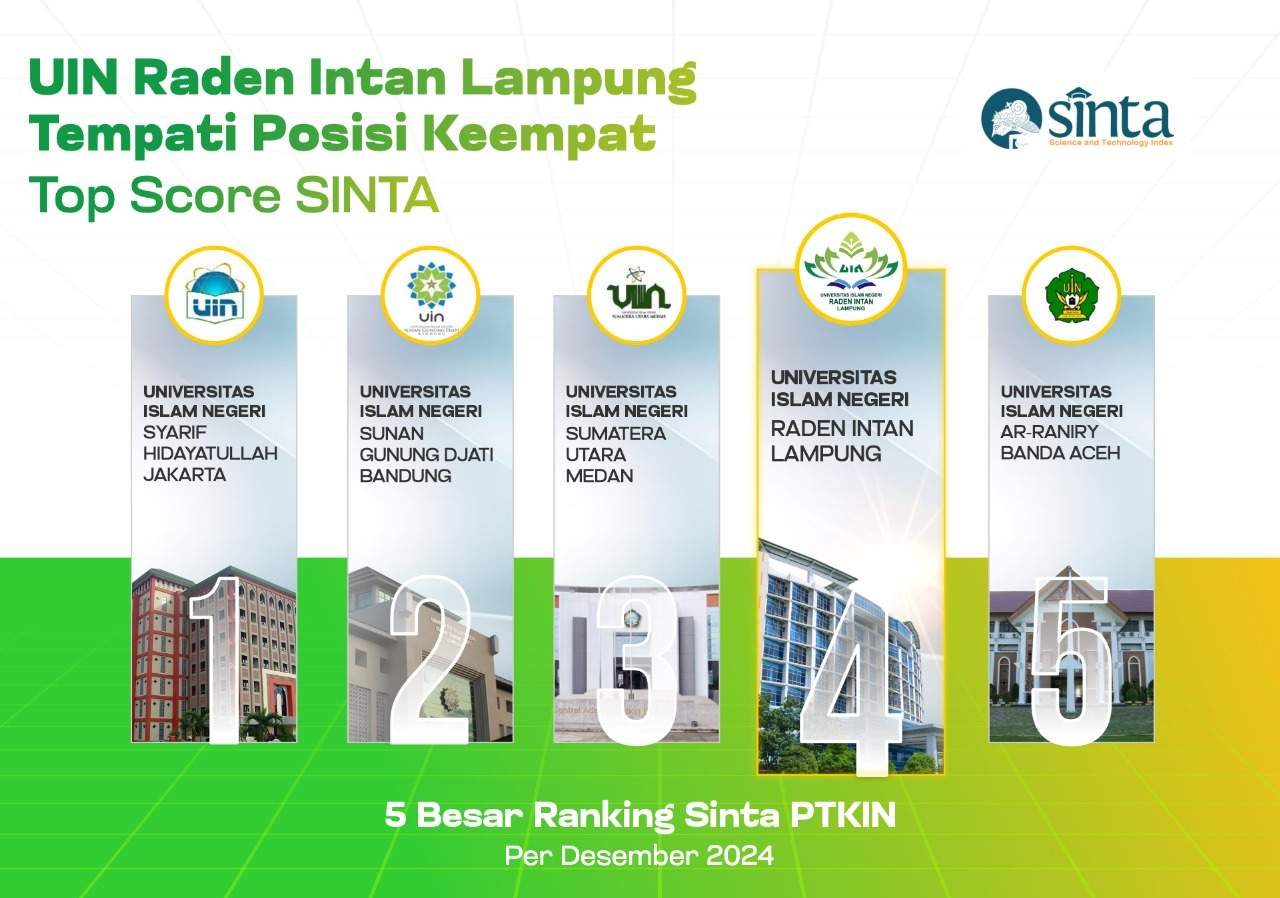 UIN Raden Intan Lampung menempati posisi keempat, menyusul tiga PTKI lainnya, yaitu UIN Syarif Hidayatullah Jakarta yang menduduki posisi pertama dengan SINTA Score 3Yr sebesar 178.445, diikuti oleh UIN Sunan Gunung Djati Bandung di posisi kedua dengan skor 177.549, dan UIN Sumatera Utara di posisi ketiga dengan skor 164.082.
