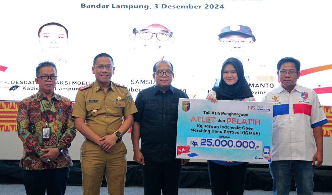Bandarlampung, – (BN.Net)  Pj. Gubernur Lampung Samsudin menyerahkan TaliAsih bagi Atlet, Pelatih dan Official berprestasi Marching Band VIP Federasi Youth Band Indonesia (FYBI) Lampung di Mahan Agung, Rumah Dinas Gubernur Lampung, Bandarlampung, Selasa (3/12/2024).