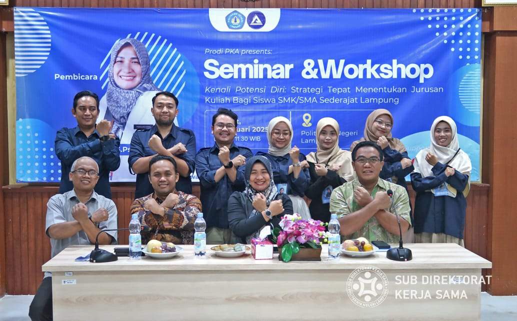 Bandarlampung,- (BN.Net) Program Studi Pengelolaan Konvensi dan Acara (PKA), Jurusan Ekonomi dan Bisnis, Politeknik Negeri Lampung (Polinela) melalui Himpunan Mahasiswa Pengelolaan Konvensi dan Acara (Himavent), sukses mengadakan seminar/workshop sebagai bagian dari pelaksanaan implementasi Project Based Learning (PBL) semester Ganjil ,yangbertajuk “Kenali Potensi Diri: Strategi Tepat Menentukan Jurusan Kuliah bagi Siswa SMK/SMA Sederajat”.