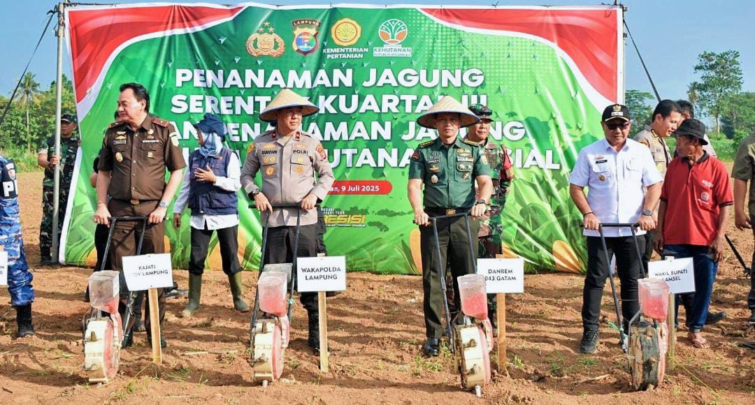 Lampung , – Kepala Staf Korem 043/Gatam, Kolonel Inf Sumarlin Marzuki, S.E., M.Han., menghadiri kegiatan penanaman jagung secara serentak yang dilaksanakan di lahan perhutanan sosial Dusun II, Desa Sumber Jaya, Kecamatan Jati Agung, Kabupaten Lampung Selatan, Rabu (09/07/2025).