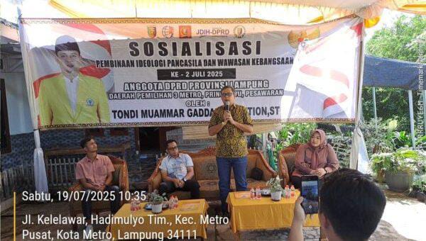 Lampung , – Dalam upaya memperkuat fondasi kebangsaan dan menjaga semangat persatuan di tengah tantangan zaman, Anggota DPRD Provinsi Lampung, Tondi Muammar Gaddafi Nasution, menegaskan pentingnya Pancasila sebagai kompas moral dan ideologi bangsa Indonesia. Hal ini ia sampaikan dalam kegiatan Sosialisasi Pembinaan Ideologi Pancasila dan Wawasan Kebangsaan di Kelurahan Hadimulyo Timur, Kecamatan Metro, Kota Metro, Sabtu (19/07/2025).