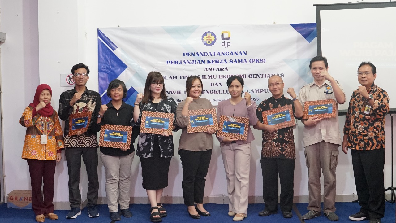 Bandarlampung, – Kanwil DJP Bengkulu dan Lampung menyerahkan Piagam Wajib Pajak (Taxpayers’ Charter) sebagai bentuk penghargaan kepada STIE Gentiaras atas komitmennya dalam mendukung pendidikan dan kesadaran perpajakan. Penyerahan Piagam dilakukan oleh Kepala Kanwil DJP Bengkulu dan Lampung, Retno Sri Sulistyani, pada acara yang berlangsung di Ruang Kerja Kepala STIE Gentiaras, Kota Bandar Lampung.