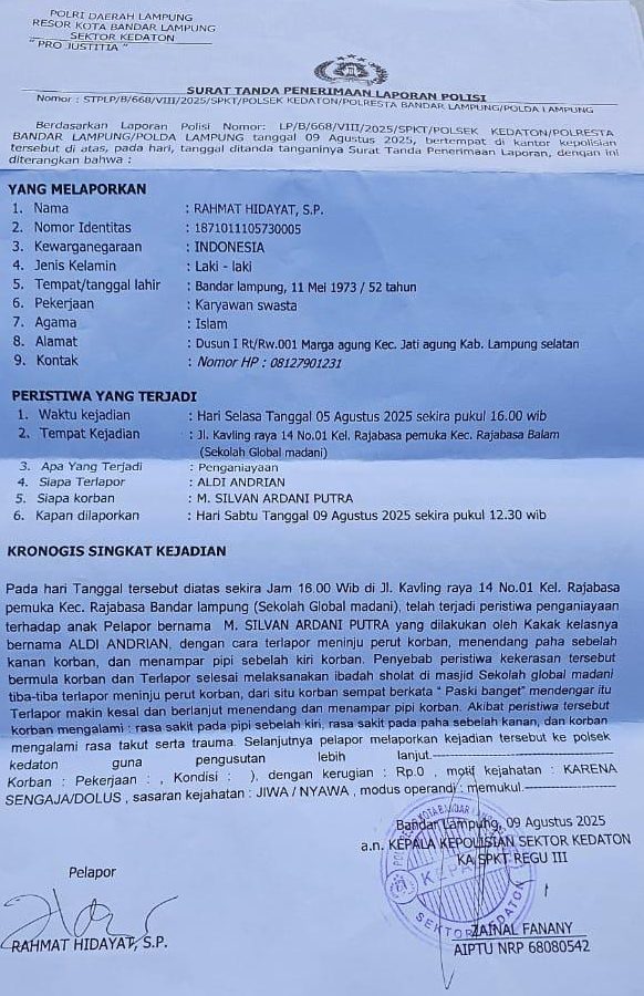 Bandarlampung, – Diduga terjadi penganiayan secara berkelanjutan di dalam lingkungan Sekolah Global Madani, Rahmat Hidayat, S.P. pada Sabtu (09/08/2025) lalu membuat laporan ke Polsek Kedaton.