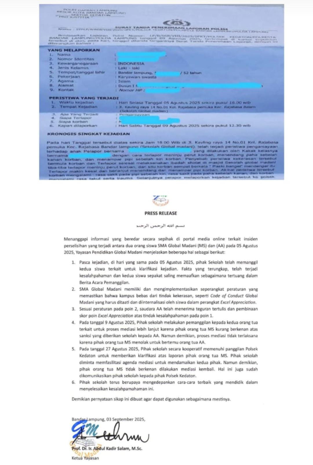 4. Koordinasi dengan Kepolisian: Sekolah telah memenuhi panggilan dari Polsek Kedaton pada 27 Agustus 2025 untuk memberikan klarifikasi dan diminta memfasilitasi mediasi. Namun, upaya tersebut kembali ditolak oleh orang tua korban.