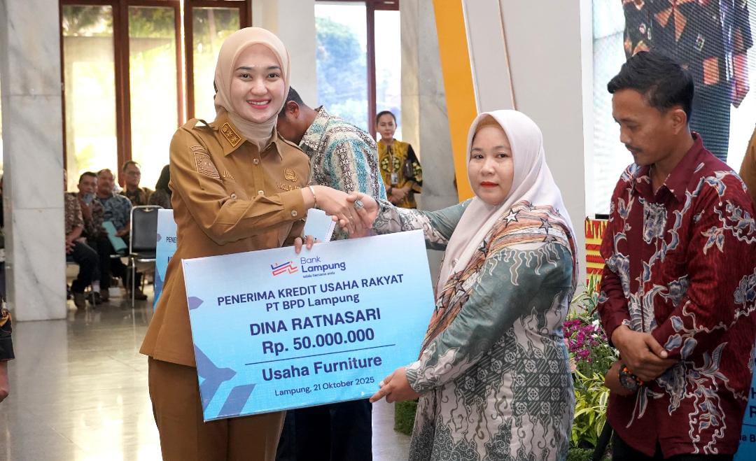 Bandarlampung, – Wakil Gubernur Lampung, Jihan Nurlela menyerahkan Kredit Usaha Rakyat (KUR) kepada empat perwakilan pelaku UMKM asal Lampung pada kegiatan Akad Massal KUR 800.000 Debitur untuk Penciptaan Lapangan Kerja dan Peluncuran Kredit Program Perumahan (KPP), di Mahan Agung, Bandar Lampung, Selasa (21/10/2025).