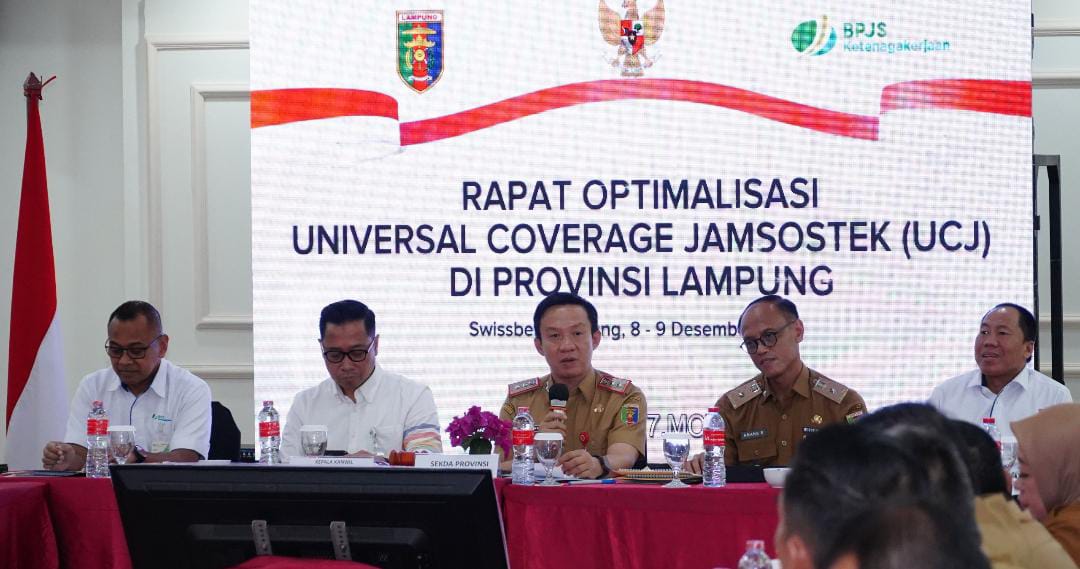Bandarlampung, – Sekretaris Daerah Provinsi Lampung, Marindo Kurniawan, mewakili Gubernur Lampung, membuka Rapat Optimalisasi Universal Coverage Jaminan Sosial Ketenagakerjaan (UCJ) Provinsi Lampung di Swiss-Belhotel, Senin (8/12/2025).