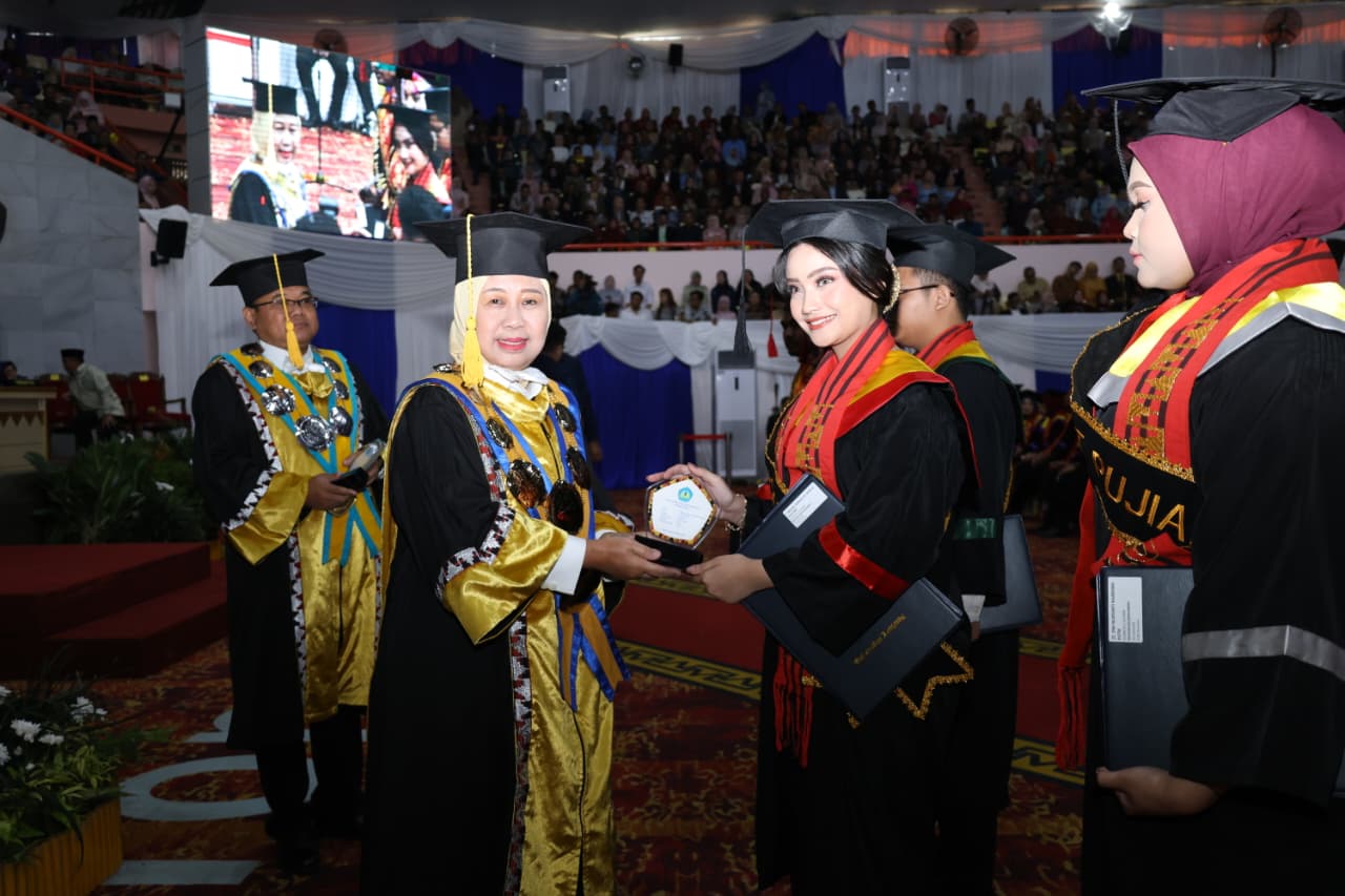 Rektor Unila, Prof. Dr. Ir. Lusmeilia Afriani, D.E.A., IPM., ASEAN Eng., menyampaikan ucapan selamat kepada para lulusan dan ucapan terima kasih serta penghargaan kepada pihak-pihak terkait atas kerja keras dan kerja sama dalam melaksanakan tugas mendidik mahasiswa.
